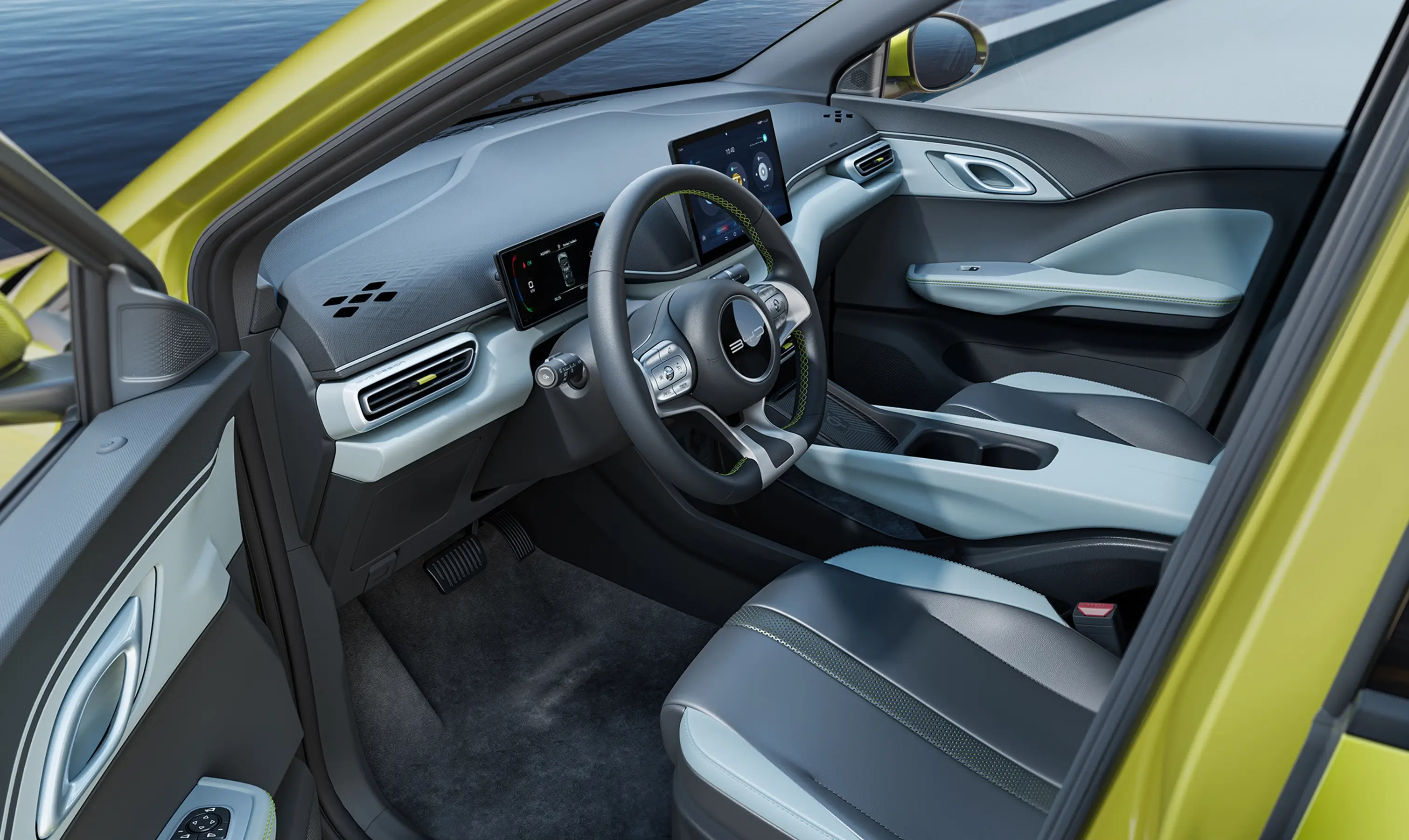 El interior y exterior del BYD SEAGULL están unificados en forma y textura, desde el puerto de descongelación hasta el altavoz, utilizando un efecto 3D de escarchado de cristal de hielo. Esto crea un ambiente único para todo el vehículo, unificando el diseño interno y externo con una personalidad exclusiva.